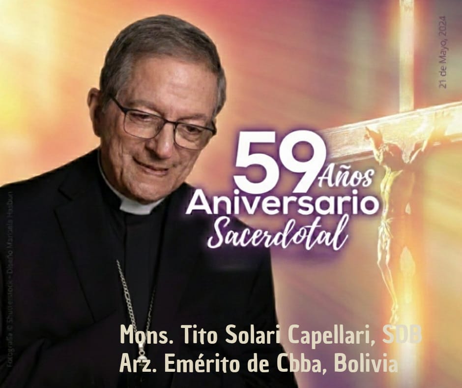 La Parroquia María Auxiliadora se une con alegría y gratitud para felicitar a Monseñor Tito Solari, SDB, en la celebración de sus 59 años de aniversario sacerdotal. Su vida es un testimonio de fidelidad al Evangelio y de entrega generosa al carisma salesiano, siempre comprometido con el amor por los jóvenes, siguiendo el ejemplo de San Juan Bosco. Durante décadas, Monseñor Solari ha acompañado a la Iglesia en Bolivia con sencillez, cercanía y espíritu conciliador, sembrando esperanza y construyendo comunidad. Su presencia ha sido fuente de inspiración para sacerdotes, religiosos y laicos, especialmente para quienes trabajan en la misión salesiana de educar y evangelizar. Hoy, la Parroquia María Auxiliadora eleva una oración de acción de gracias por su ministerio y pide al Señor que continúe bendiciendo su vida y misión.